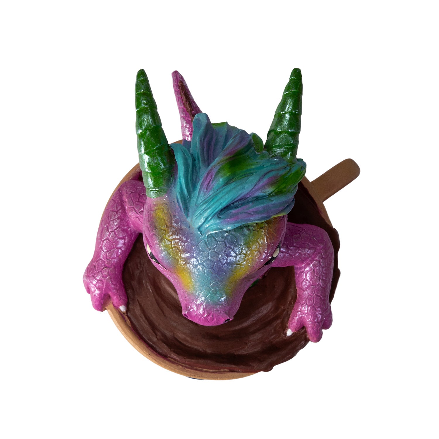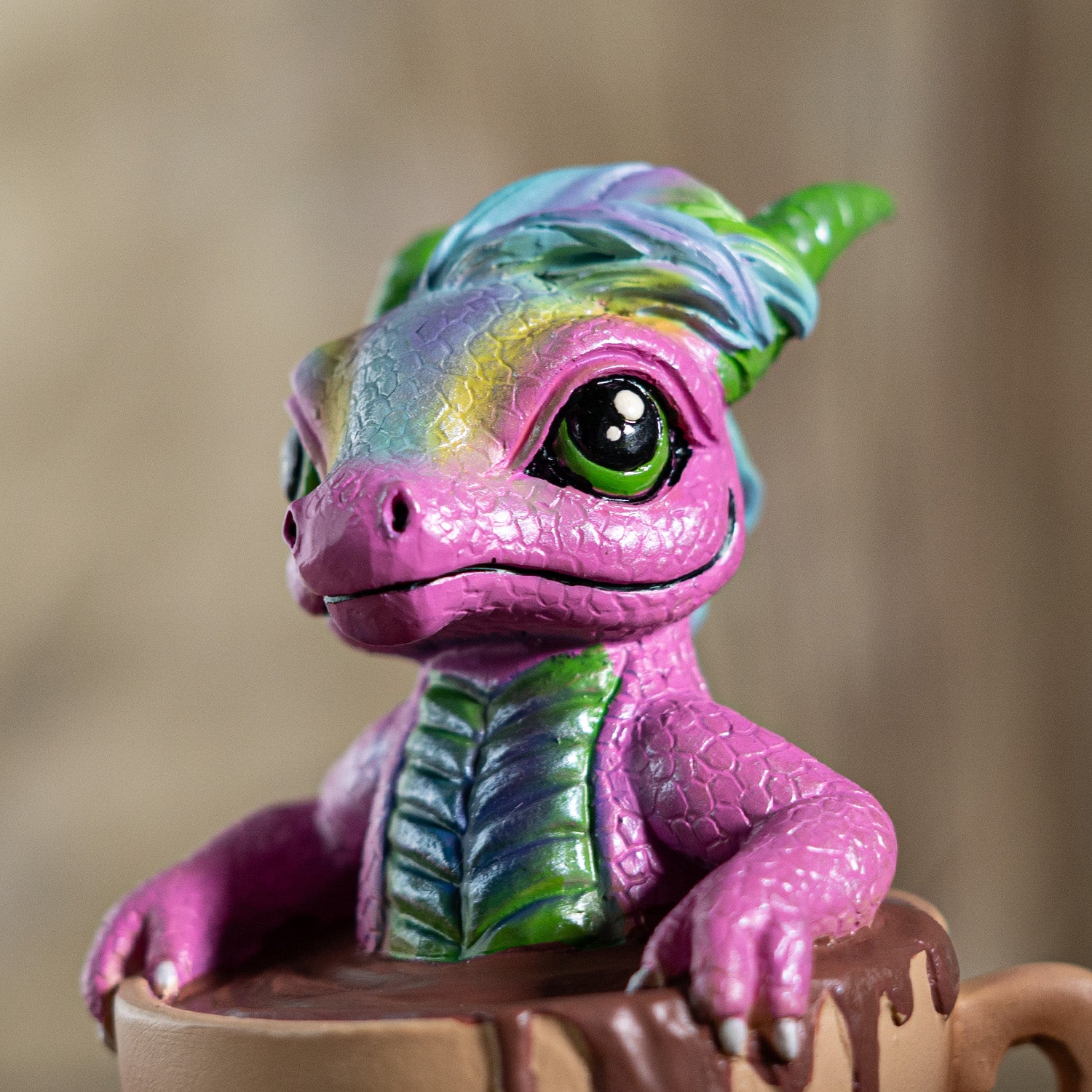 This little cutie has a bit of a sassy streak, can you tell? The adorable figurine is part of Ruth Thompson's newest line of drink dragons! Franky has vibrant pink scales accented with a rainbow of other hues, and relaxes in a cup of cappuccino. A great gift for the coffee lovin' fantasy fan in your life!