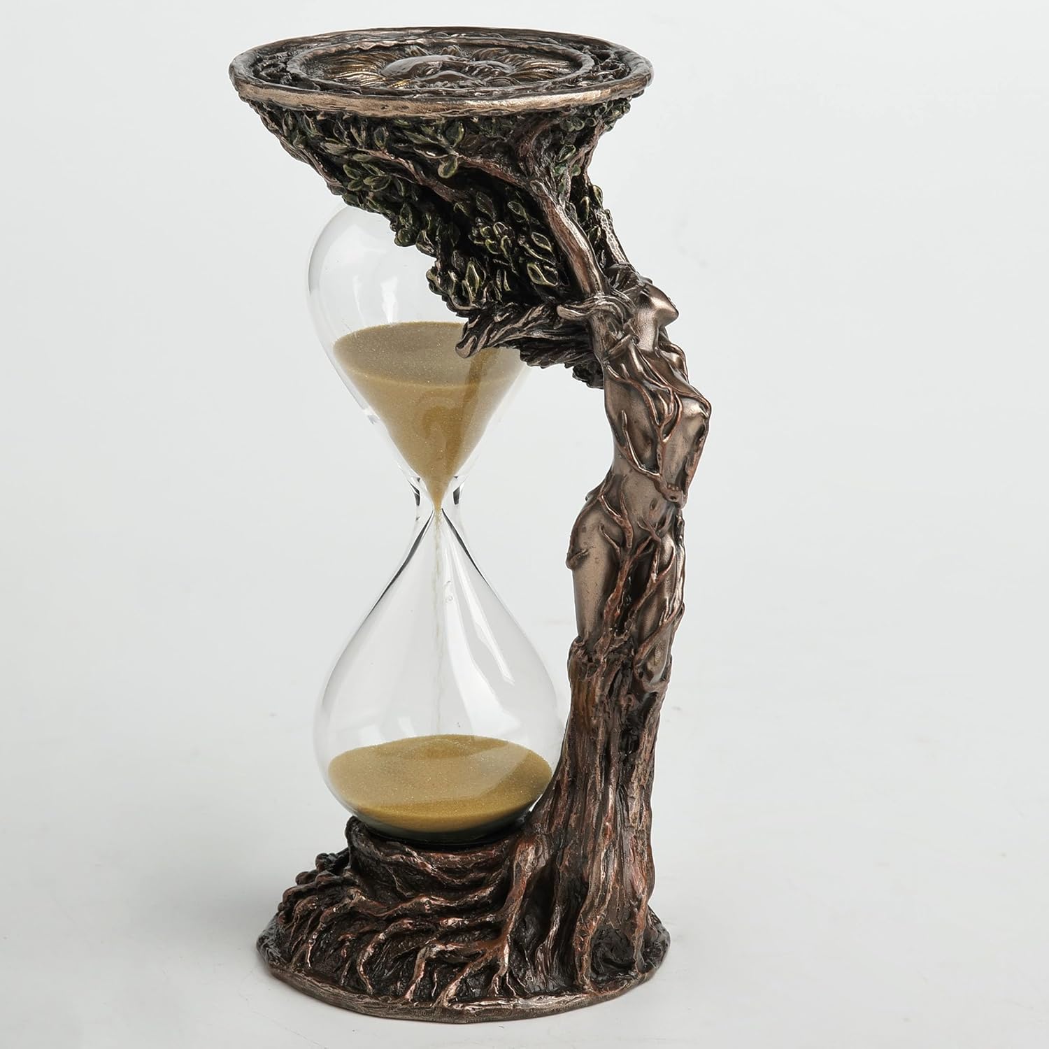Contemplate the striking intersections of mythology, art, and time as you gaze at this beautiful hourglass! The piece features a dryad, a tree spirit who might sometimes take the form of a beautiful woman. The hourglass if functional as well, with sand that flows from one end to the other, mirroring the rhythm of nature and passage of each moment. A wonderful gift for anyone with an eye for unique beauty and a love for the ancient myths!
