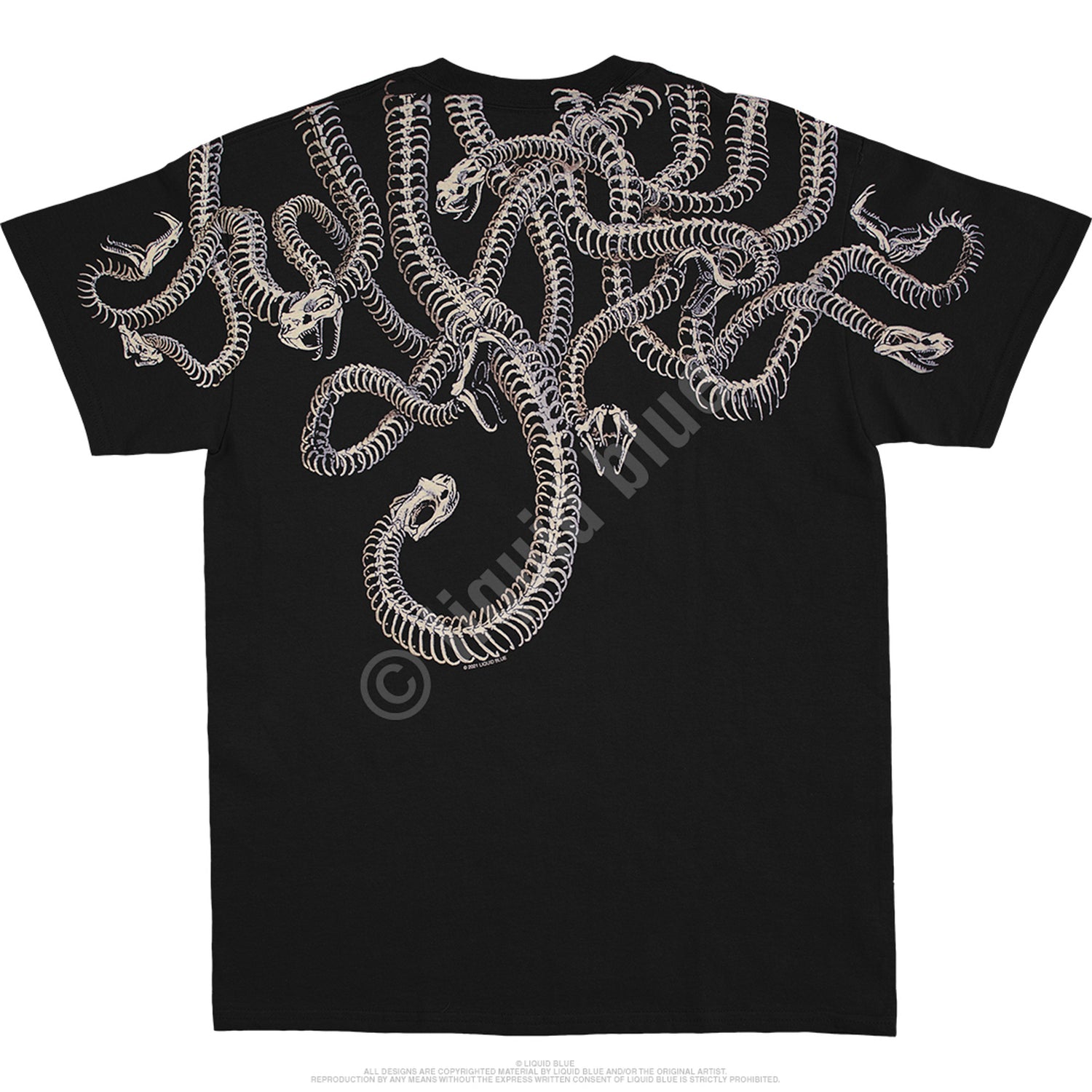 This macabre tee features a skull with glowing, fiery eyes, the snarling face wreathed in the skeletons of snakes instead of hair. Her eyes might still capture those who gaze upon them for too long...