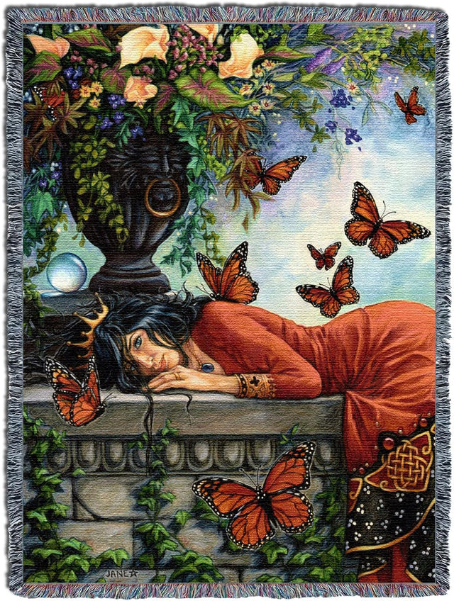 Let the artwork of Jane Starr Weils sweep you away! This beautiful tapestry doubles as a comfortable blanket. An ebony-haired woman in a red dress and golden crown lies upon a stone slab, a beautiful planter full of blooming flowers above her, and orange monarch butterflies flittering about around her. A magical, courtly display!