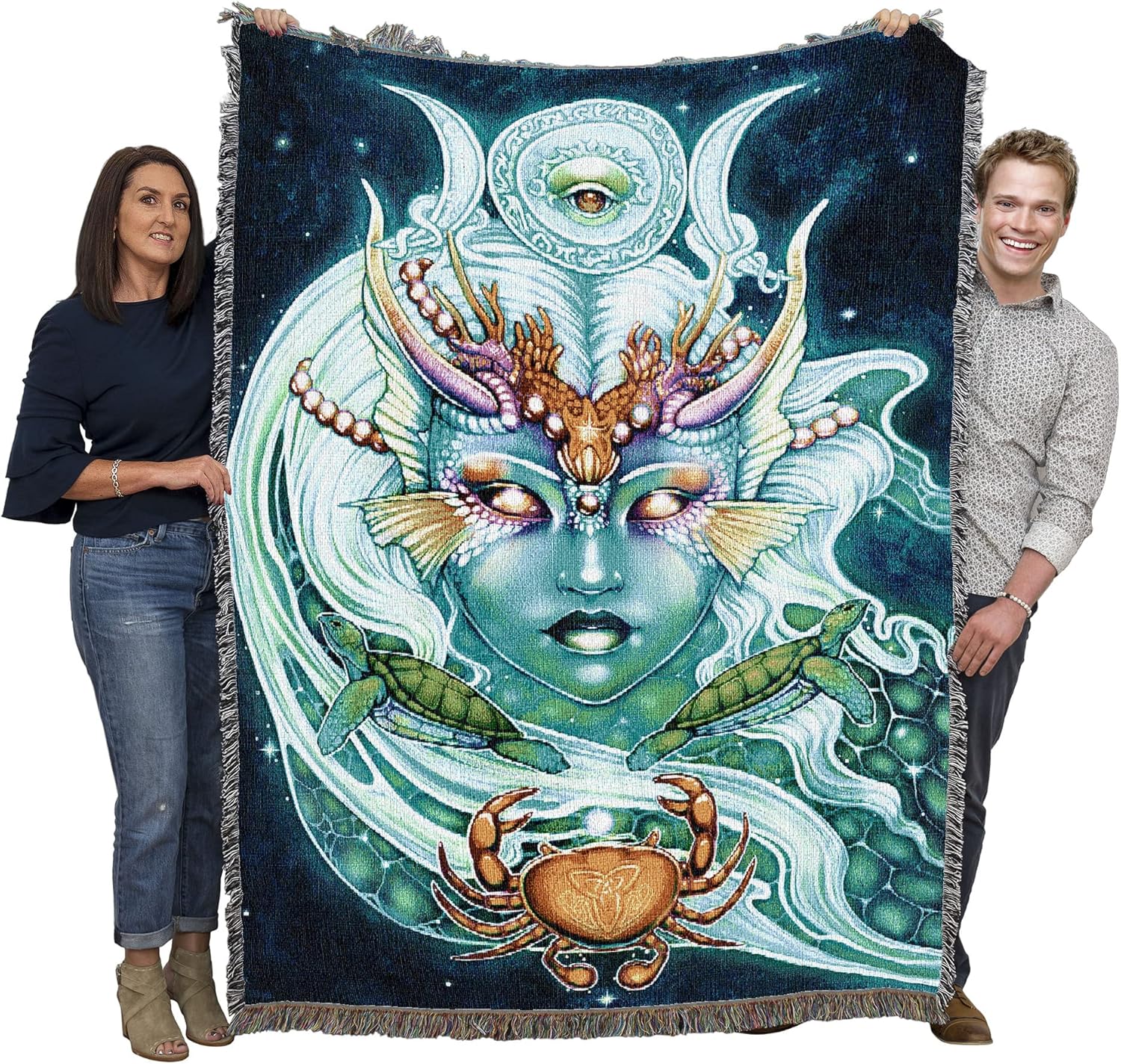 Celebrate the magic of the ocean with this incredible tapestry blanket! The face of the queen of the sea peers out, accented with fins and coral, horns and pearls. Turtles and a crab accompany her, and the phases of the moon hover above.