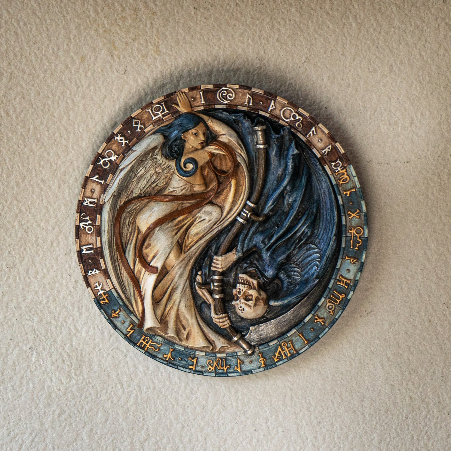 Life and death, good and evil, dark and light... all things must be balanced. This plaque shows that, harkening to the yin yang symbol. A white angel curves across one side, but a shock of dark hair brings the darker hues to her visage. Opposite her in all ways is a skeletal grim reaper holding his scyth, though the pale of his grinning skull offers a brief flash of lightness. A unique must-have!