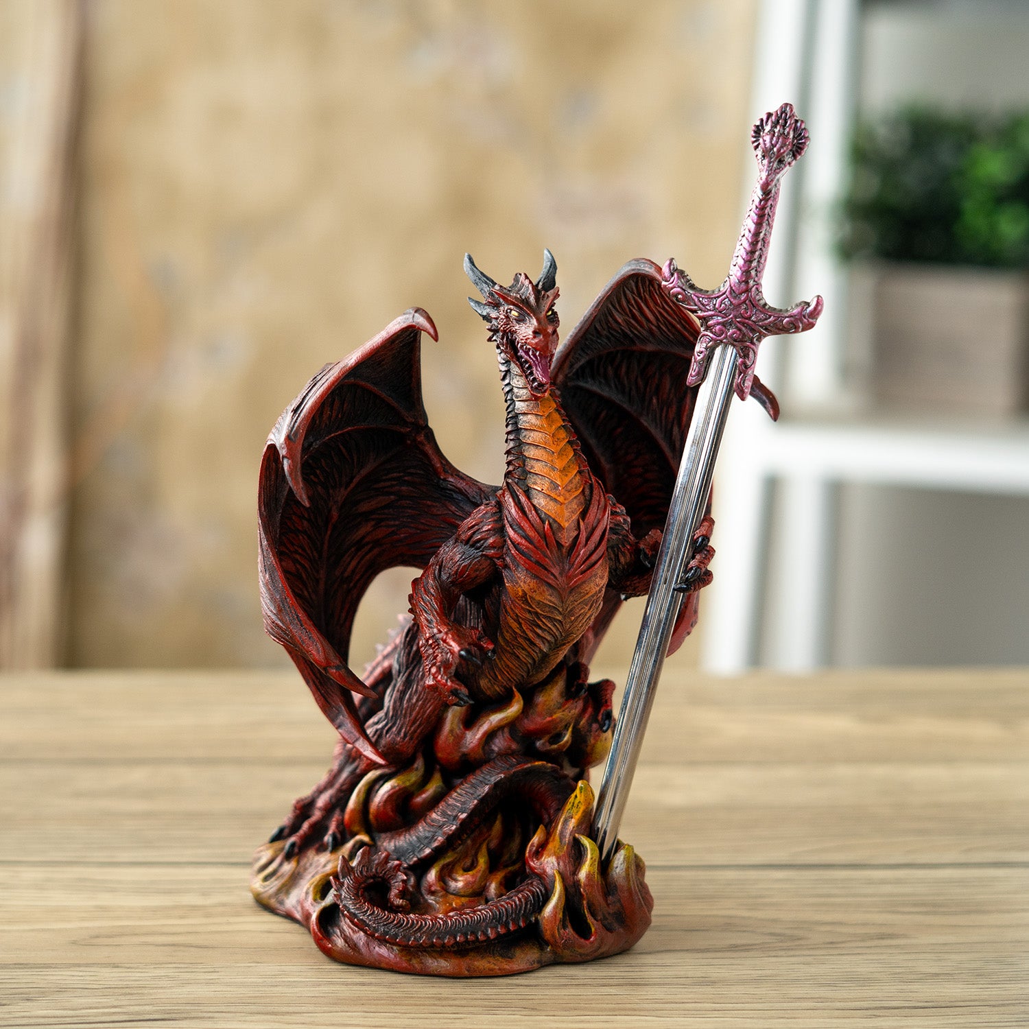 Fire and ferocity! This figurine doubles as a letter opener, making it the perfect office accent to add a touch of fantasy and magic. A red and orange dragon dances amidst the fires of his lair. Held in one claw is an impressive sword, which is removable to help you open your mail in style!