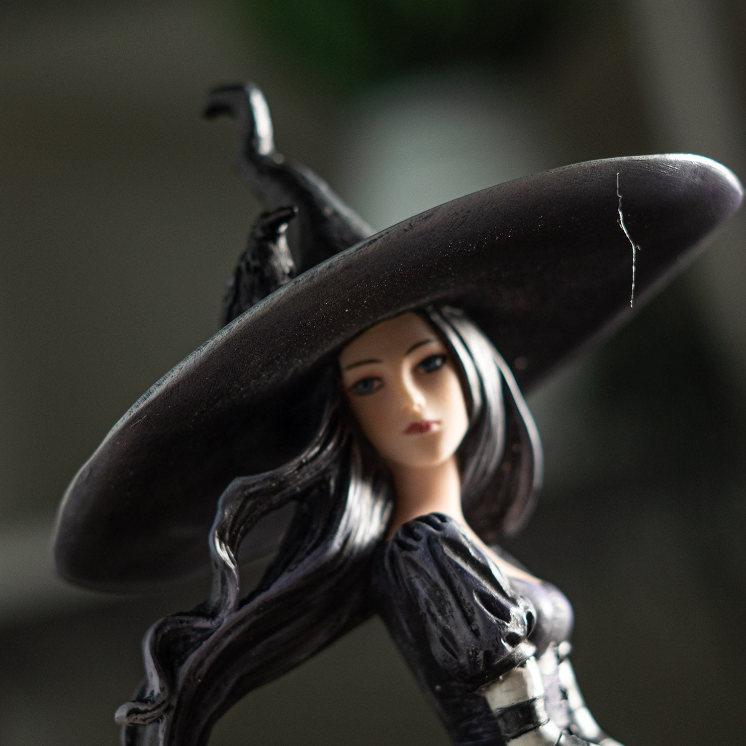 This stunning figurine is the perfect piece for Halloween! Based on the iconic artwork of Amy Brown, it features a witch in a moody dress and big hat, her hair billowing in an unseen breeze. Next to her is a festive pumpkin, and perched upon it and on her hat are ravens. An excellent gift for any fantasy collector!