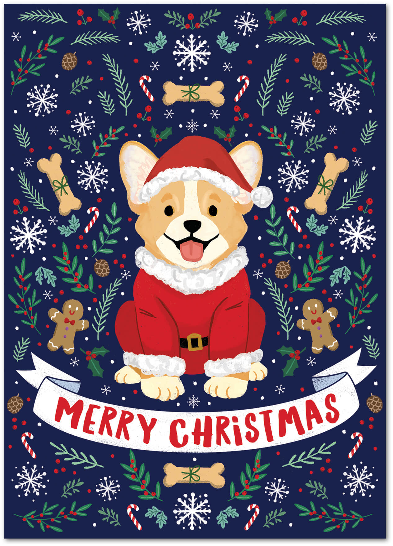 All of the very good boys and good girls will get a visit this Christmas... from Santa Corgi! These too cute holiday cards feature a Corgi pup front and center, all decked out for delivering milk bones and squeaky toys. Surrounding the dog is a festive array of holiday items, and a message of Merry Christmas is written on a banner, and glitter adds some sparkle. Sure to bring a smile to anyone's face!