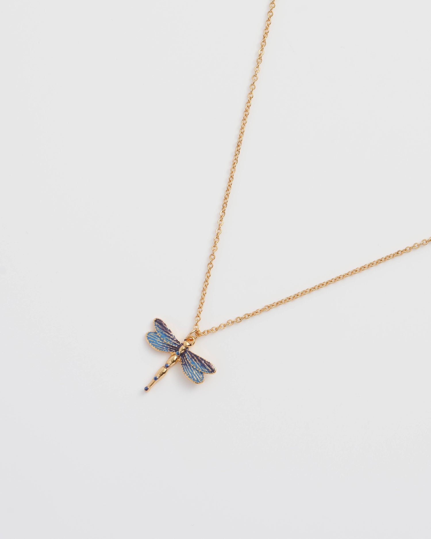 This exquisite necklace showcases a beautifully crafted dragonfly pendant, intricately adorned with four striking blue crystals that catch the light with every movement. The wings of the dragonfly are enhanced with delicate hand-painted enamel work and shimmering gold detailing, adding a touch of elegance and artistry. The adjustable gold-plated chain allows for versatile wear, making it ideal for layering with other pieces.