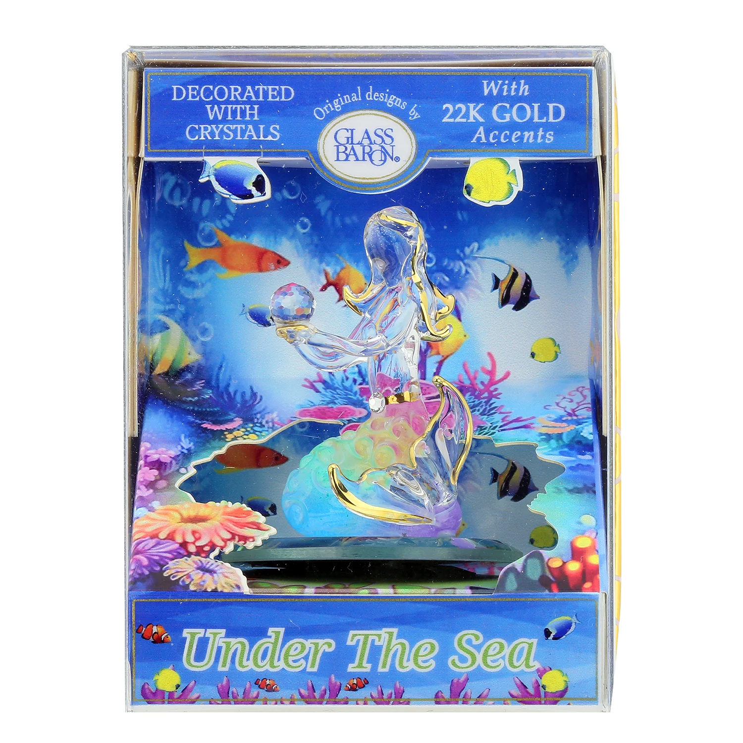 Glass mermaid figurine with crystal orb in a colorful fishy keepsake box with Glass Baron label and "Under the Sea"