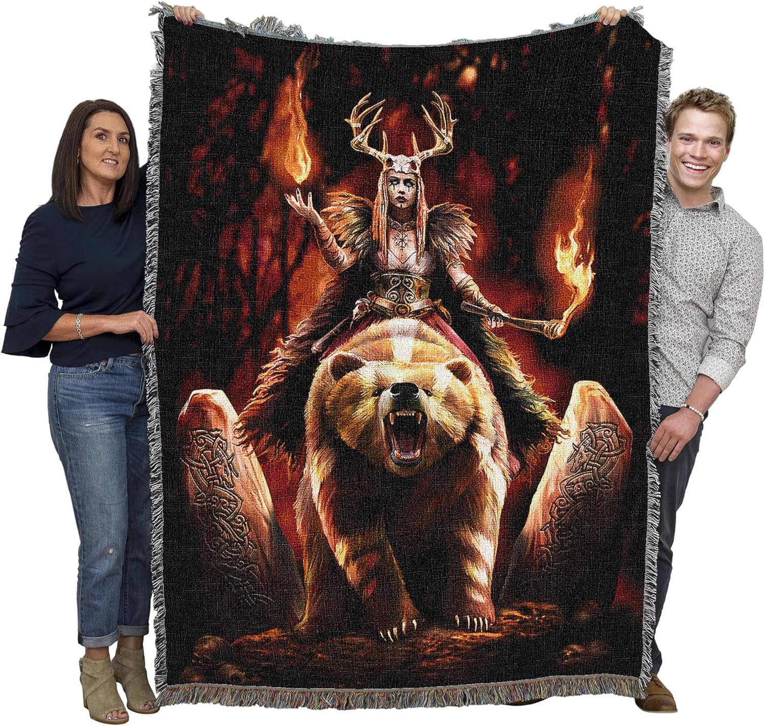 Magic and mayhem will come to all who cross her path! This amazing blanket shows off the artwork of Anne Stokes. A woman in furs and antlers rides forth upon a painted war bear. The sorceress wields a torch in one hand, and fire hovers above the other, with Viking runestones to either side. A dramatic piece for the home!