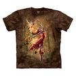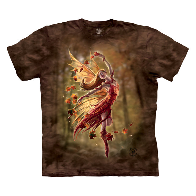 A beautiful fairy dances her way across this mottled, tie-dye tee! The shirt shows of an autumn pixie, fall leaves curling around her in the air, complementing her orange, yellow and red dress, wings, and hair. The perfect addition to your wardrobe!
