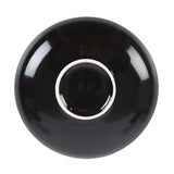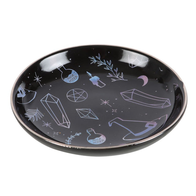 Round trinket dish with witchy designs of hat, crystals, plants, candles in gradient blue purple on black background
