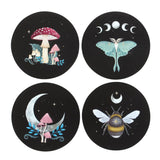 This enchanting set of coasters features dark forest details, including a lush mushroom landscape, a luna moth accented by moon phases, a pastel mushroom cradled by a crescent moon, and a bumblebee under a twinkling starlit sky. Perfect for adding a magical touch to any table setting while protecting delicate surfaces! A great housewarming gift.