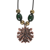 Let the lord of the forest accompany you wherever you might go! This beautiful necklace features the Green Man's face front and center on a dangling pendant, flanked by glass beads. Protector of the trees and the critters and spirits that dwell within, this Greenman will watch over you, too. The necklace is strung on a black cord, with a lobster clasp closure.