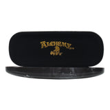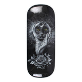 Add some mystic feline energy to your day when you keep your glasses safe in this hard shell case! A black cat gazes out from a crystal ball, held up by a hand covered in arcane symbols and sigils, with a rose at the base.