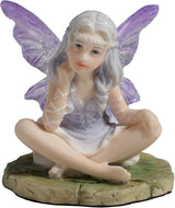 This sweet pixie might be little, but she's thinking some big thoughts! The charming figurine shows off a fairy sitting cross-legged on a mossy rock, having a good long think. She's got pale hair, a violet-tinged dress, and purple-clear wings, and is just perfect for anyone with a love of fantasy!
