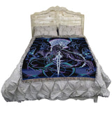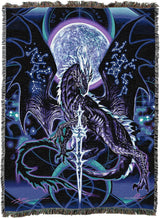 This glorious tapestry will bring the night sky and some fantasy magic into your world! The blanket will be striking used as either a throw on couch or bed, or hung on the wall. It features the art of Ruth Thompson with one of her captivating Dragonblades. This dragon is adorned with constellations on his wings and a silver sword in front of him, while the full moon rises beyond. A perfect gift, practical, cozy and beautiful!