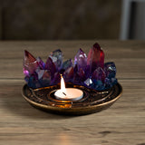 Who doesn't love crystals? This awesome tealight holder features a striking array of resin gem points in shades of pink, purple and blue on a faux-gold base. Light up a candle and let it glow through the translucent jewel shapes!