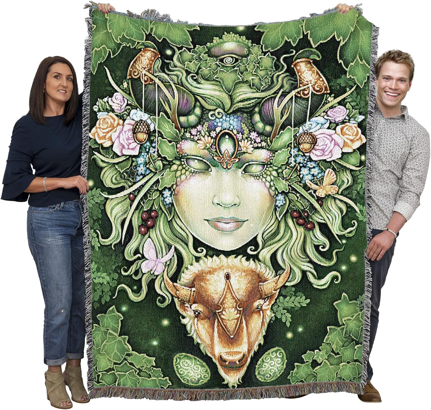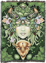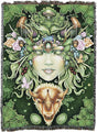 Nature itself is a vision upon this awesome blanket! The artowrk of Ravynne Phelan shows a face in green, feminine and beautiful, accented with flwoers, acorns, and insects, with a wise bison below. A take on the Green Woman, protector of flora and fauna, incarnation of Mother Nature herself.