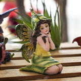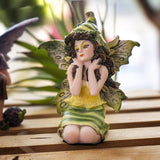 The perfect inhabitant for a fairy garden! This little pixie sits with her legs tucked under her, a flower bud hat on her head. She has a dress and wings of yellow and green, and rich brown hair. A magical friend!